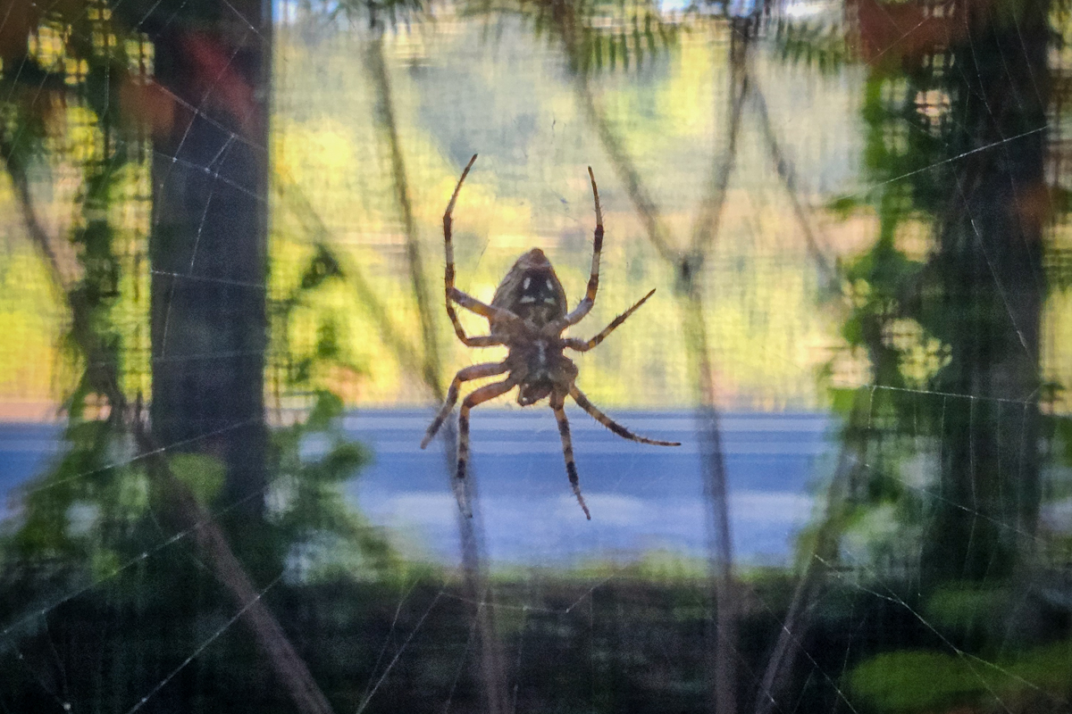 Back home, I've inadvertently taken in a boarder. This orb weaver has been hanging outside my kitchen window for the past week or so: